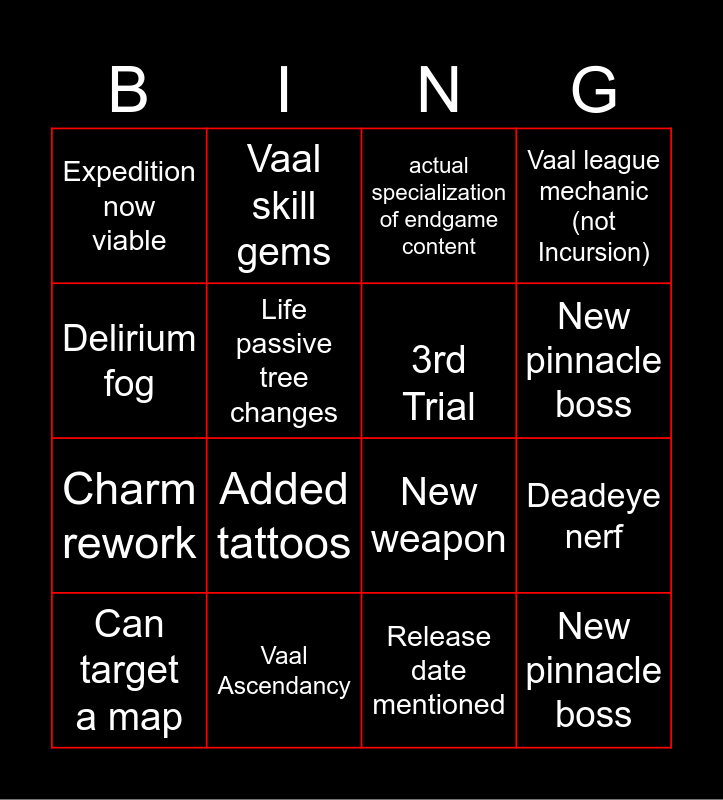 This bingo card has 17 words: Release date mentioned, Can target a map, actual specialization of endgame content, Expedition now viable, Added tattoos, Vaal league mechanic (not Incursion), Deadeye nerf, 3rd Trial, New pinnacle boss, Life passive tree changes, Vaal Ascendancy, New weapon, Delirium fog, Vaal skill gems, Charm rework, New crafting method and New pinnacle boss.