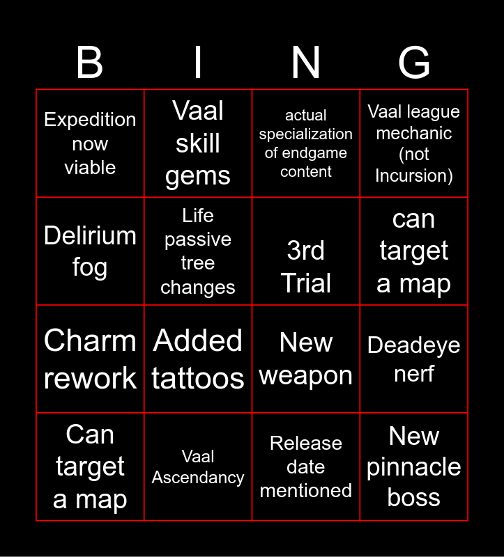 This bingo card has 17 words: Release date mentioned, Can target a map, actual specialization of endgame content, Expedition now viable, Added tattoos, Vaal league mechanic (not Incursion), Deadeye nerf, 3rd Trial, can target a map, Life passive tree changes, Vaal Ascendancy, New weapon, Delirium fog, Vaal skill gems, Charm rework, New crafting method and New pinnacle boss.