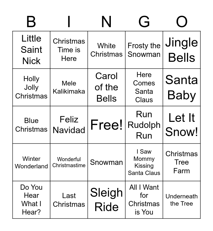 This bingo card has a free space and 30 words: Last Christmas, Jingle Bell Rock, Feliz Navidad, It's Beginning to Look a Lot like Christmas, Little Saint Nick, White Christmas, Mele Kalikimaka, Snowman, Run Rudolph Run, Sleigh Ride, Let It Snow!, Underneath the Tree, All I Want for Christmas is You, Rockin' Around the Christmas Tree, Santa Baby, Baby It's Cold Outside, I Saw Mommy Kissing Santa Claus, Winter Wonderland, Wonderful Christmastime, Jingle Bells, Blue Christmas, It's the Most Wonderful Time of the Year, Christmas Time is Here, Here Comes Santa Claus, Holly Jolly Christmas, Frosty the Snowman, Christmas Tree Farm, Do You Hear What I Hear?, Carol of the Bells and Rudolph the Red Nosed Reindeer.