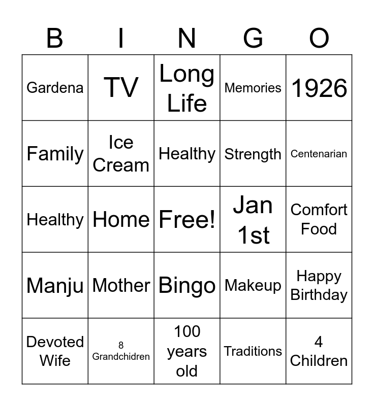This bingo card has a free space and 24 words: Mother, 8 Grandchidren, Healthy, Devoted Wife, 1926, Gardena, Family, TV, Jan 1st, Bingo, Strength, Healthy, Makeup, Happy Birthday, Ice Cream, Traditions, Comfort Food, Long Life, Centenarian, Home, 4 Children, Manju, Memories and 100 years old.