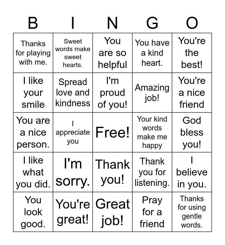 This bingo card has a free space and 24 words: I'm sorry., You're great!, I'm proud of you!, You look good., You're the best!, Thanks for playing with me., I like your smile, Sweet words make sweet hearts., Your kind words make me happy, Thank you!, Amazing job!, You are a nice person., Thank you for listening., I believe in you., Spread love and kindness, Pray for a friend, God bless you!, You are so helpful, You're a nice friend, I appreciate you, Thanks for using gentle words., I like what you did., You have a kind heart. and Great job!.