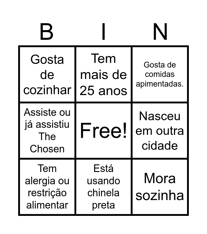 This bingo card has a free space and 65 words: Nasceu no mesmo mês que você, Tem irmã (o) mais velho, Tem 2 ou mais animais de estimação, Usa óculos, Já morou em outra cidade, Já quebrou um osso, Tem mais de 25 anos, Ama gatos, Está usando chinela preta, Já viajou para mais de 3 estados diferentes, Saiba dançar ballet, Seja canhoto, Toque algum instrumento, Mora sozinha, Tem nome composto, Nasceu em outra cidade, Tem a mesma idade que você, Gosta de cozinhar, Tem dons artísticos (música, arte, dança), Já viu algum show internacional, É filha única, Fala uma palavra em outro idioma (não inglês/espanhol)., Assiste ou já assistiu The Chosen, Cuida de plantas ou tem um jardim, Pratica esporte, Caiu no meio da rua ou em público (e não se machucou)., Está com uma peça de roupa preta, Faz ações voluntárias, Já leu a Bíblia toda, Não Gosta de Chocolate, Gosta de açaí, Não come carne, Mora na mesma casa desde que nasceu, Não come comida japonesa, Já teve mais de 1000 seguidores em alguma rede social, Tem o mesmo celular há mais de 2 anos., Gosta de café, Gosta de jogar video game, Já fez alguma cirurgia, Saiba dirigir (carro ou moto), Tem alergia ou restrição alimentar, Sabe o número decorado dos pais sem olhar na agenda, Tem filhos, Está usando relógio, Está na faculdade (estudante), Está com esmalte recente, Já pulou de paraquedas, Já assistiu jogo de futebol em estádio, Já deu uma entrevista, Tem alguma coleção, Não gosta de Cachorro, Tem papagaio em casa, Faz aniversário no mesmo mês de alguém no grupo, Teve uma resposta de oração surpreendente essa semana., Já fez algum tipo de voluntariado (ajuda na igreja, social, etc.)., Consegue assobiar., Prefere filme de ação a comédia romântica., Gosta de comidas apimentadas., Leu a Bíblia hoje., Conhece uma citação marcante de um líder cristão famoso (ex: C.S. Lewis, Billy Graham etc)., Alguém sempre disponível, Já visitou asilo de idosos, Já visitou um orfanato, Tem viagem marcada ainda para esse ano and Mora perto da IASD Local (menos de 2km).
