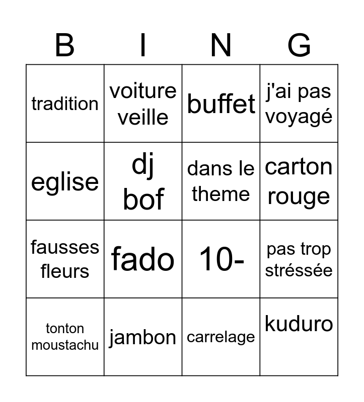 This bingo card has 16 words: jambon, pas trop stréssée, buffet, tradition, fausses fleurs, voiture veille, 10-, carrelage, eglise, dj bof, tonton moustachu, j'ai pas voyagé, fado, carton rouge, dans le theme and kuduro.