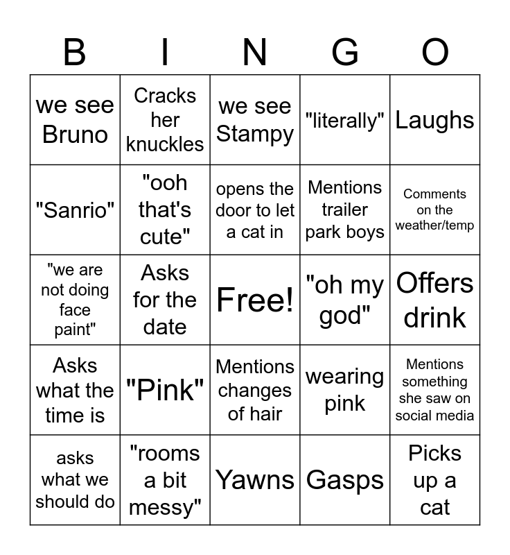 This bingo card has a free space and 24 words: "Pink", "rooms a bit messy", opens the door to let a cat in, asks what we should do, Laughs, we see Bruno, "Sanrio", Cracks her knuckles, "oh my god", Mentions changes of hair, Mentions trailer park boys, "we are not doing face paint", wearing pink, Mentions something she saw on social media, "ooh that's cute", Gasps, Offers drink, we see Stampy, Comments on the weather/temp, Asks for the date, Picks up a cat, Asks what the time is, "literally" and Yawns.
