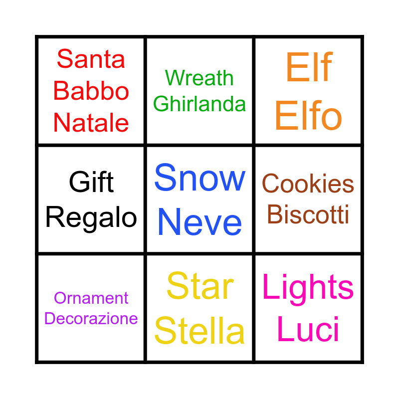 This bingo card has a free space and 8 words: Cookies Biscotti, Elf Elfo, Wreath Ghirlanda, Ornament Decorazione, Santa Babbo Natale, Lights Luci, Gift Regalo and Star Stella.