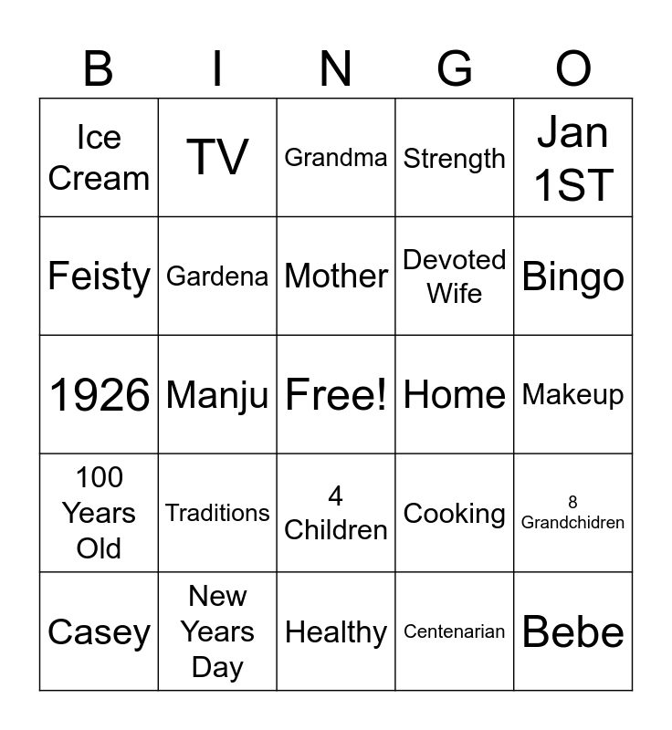This bingo card has a free space and 24 words: Traditions, New Years Day, Mother, Casey, Jan 1ST, Ice Cream, Feisty, TV, Home, 4 Children, Devoted Wife, 1926, Cooking, 8 Grandchidren, Gardena, Centenarian, Makeup, Grandma, Bingo, Manju, Bebe, 100 Years Old, Strength and Healthy.
