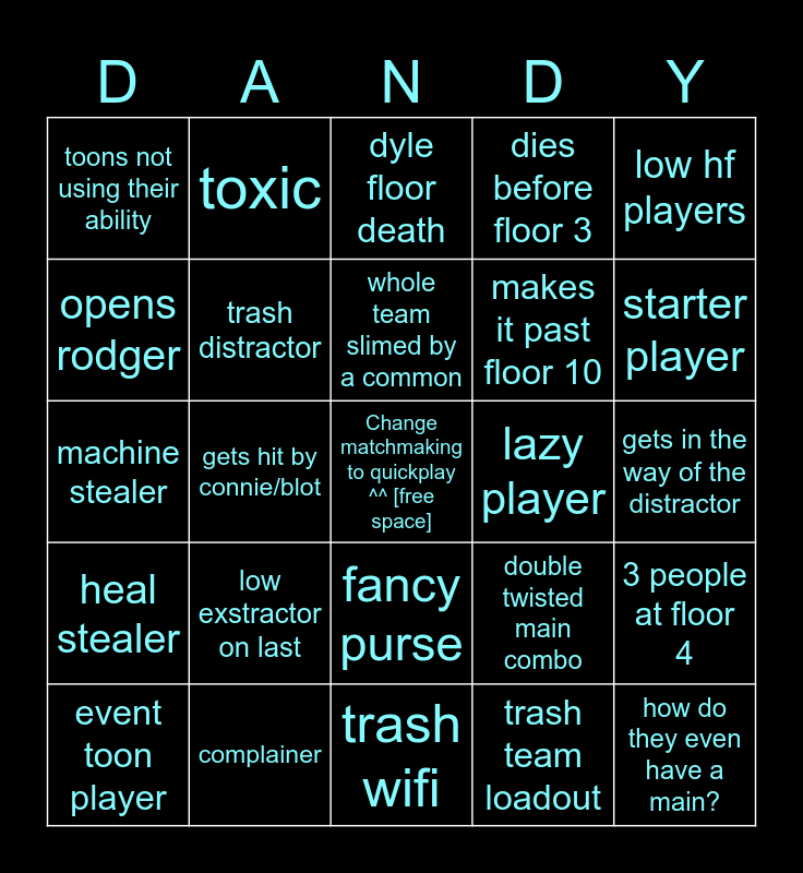 This bingo card has a free space and 34 words: No distractor, trash team loadout, over 10 min for a single floor, useless toon, heal stealer, trash distractor, low hf players, event toon player, toxic, main spawns, whole team slimed by a common, dyle floor death, dosent make it past floor 5, actually good team?, lazy player, starter player, complainer, machine stealer, low exstractor on last, double twisted main combo, fancy purse, TRASH TRINKETS, toons not using their ability, gets in the way of the distractor, trash wifi, how do they even have a main?, dies before floor 3, Skill issue, makes it past floor 10, opens rodger, wakes rnd, gets hit by connie/blot, 3 people at floor 4 and craft sibling/gigi spawns.