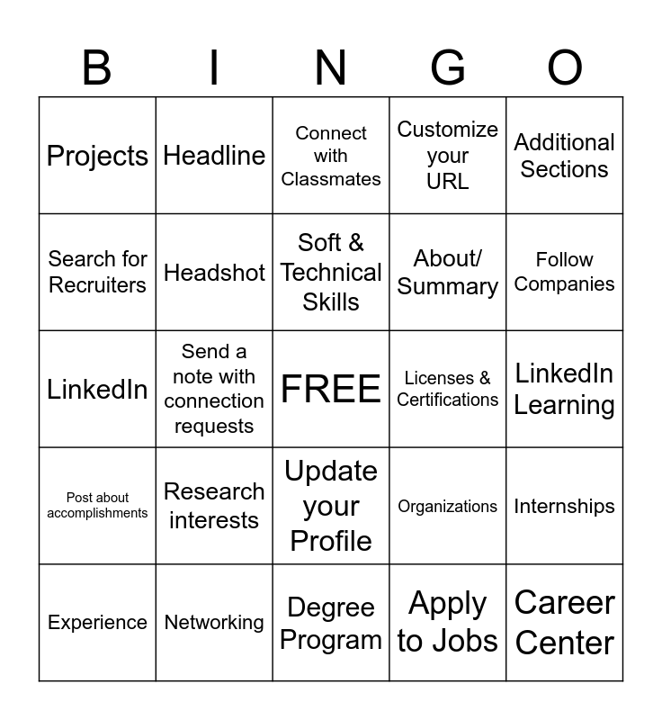This bingo card has a free space and 24 words: Research interests, Networking, Soft & Technical Skills, Experience, Additional Sections, Projects, Search for Recruiters, Headline, Licenses & Certifications, Update your Profile, About/ Summary, LinkedIn, Organizations, Internships, Headshot, Apply to Jobs, LinkedIn Learning, Connect with Classmates, Follow Companies, Send a note with connection requests, Career Center, Post about accomplishments, Customize your URL and Degree Program.