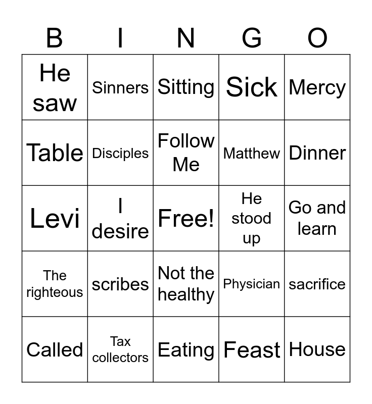 This bingo card has a free space and 24 words: scribes, Tax collectors, Follow Me, Called, Mercy, He saw, Table, Sinners, He stood up, Not the healthy, Matthew, Levi, Physician, sacrifice, Disciples, Feast, Go and learn, Sitting, Dinner, I desire, House, The righteous, Sick and Eating.