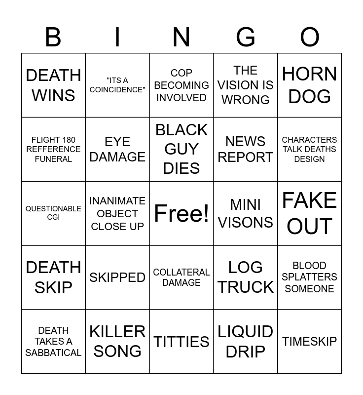This bingo card has a free space and 24 words: SKIPPED, KILLER SONG, BLACK GUY DIES, DEATH TAKES A SABBATICAL, HORN DOG, DEATH WINS, FLIGHT 180 REFFERENCE FUNERAL, "ITS A COINCIDENCE", MINI VISONS, COLLATERAL DAMAGE, NEWS REPORT, QUESTIONABLE CGI, LOG TRUCK, BLOOD SPLATTERS SOMEONE, EYE DAMAGE, LIQUID DRIP, FAKE OUT, COP BECOMING INVOLVED, CHARACTERS TALK DEATHS DESIGN, INANIMATE OBJECT CLOSE UP, TIMESKIP, DEATH SKIP, THE VISION IS WRONG and TITTIES.