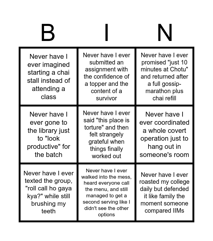This bingo card has 9 words: Never have I ever texted the group, "roll call ho gaya kya?" while still brushing my teeth, Never have I ever promised "just 10 minutes at Chotu" and returned after a full gossip-marathon plus chai refill, Never have I ever submitted an assignment with the confidence of a topper and the content of a survivor, Never have I ever gone to the library just to "look productive" for the batch, Never have I ever imagined starting a chai stall instead of attending a class, Never have I ever coordinated a whole covert operation just to hang out in someone's room, Never have I ever said "this place is torture" and then felt strangely grateful when things finally worked out, Never have I ever roasted my college daily but defended it like family the moment someone compared IIMs and Never have I ever walked into the mess, heard everyone call the menu, and still managed to get a second serving like I didn't see the other options.