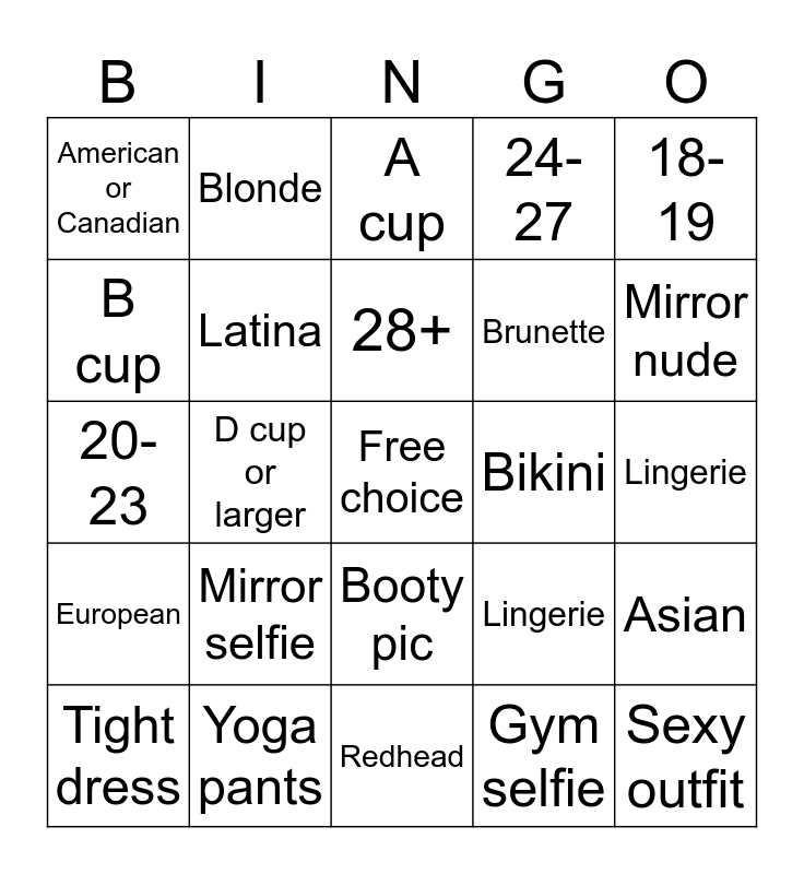 This bingo card has a free space and 24 words: Mirror selfie, Yoga pants, 28+, Tight dress, 18-19, American or Canadian, B cup, Blonde, Bikini, Booty pic, Brunette, 20-23, Lingerie, Asian, Latina, Gym selfie, Lingerie, A cup, Mirror nude, D cup or larger, Sexy outfit, European, 24-27 and Redhead.