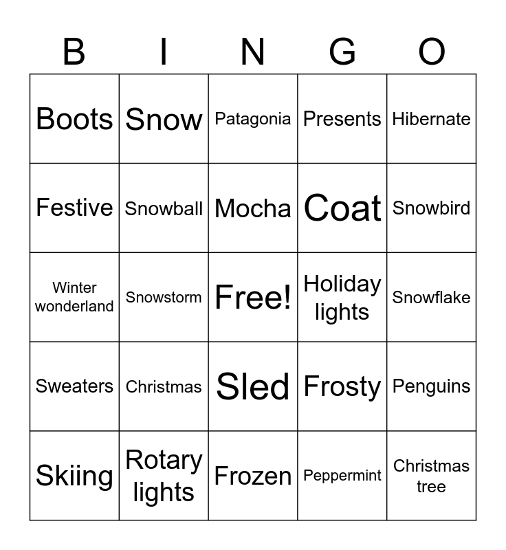 This bingo card has a free space and 42 words: Cold, Snow, Ice, Frosty, Snowflake, Skiing, Christmas, Hanukkah, Coat, Snowbird, Winter wonderland, Snowstorm, Frozen, Holiday lights, Christmas tree, Sweaters, Hot chocolate, Mocha, Brrrrr, Hibernate, Festive, Hypothermia, Cough, Presents, Ornaments, Igloo, Snowball, Buddy the elf, Sugar cookies, Penguins, Skating, Rotary lights, Patagonia, Peppermint, Candy cane, Snowmobile, Shovel, Sled, Gloves, Snowmen, Boots and Cozy.