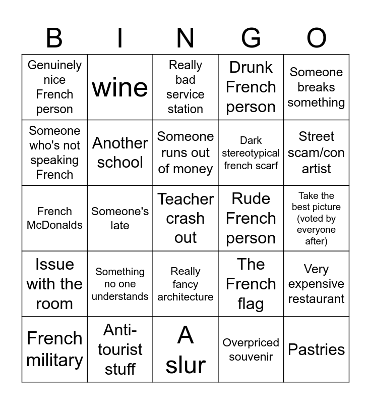 This bingo card has a free space and 49 words: Baguette, Pastries, Passive aggressive French person, A slur, Something no one understands, Eating snails, wine, mime or street performer, Someone who's not speaking French, American tourist, Another school, Drunk French person, Very expensive restaurant, The French flag, Racism, Someone gets lost, Someone runs out of money, Rude French person, Eating frogs, Someone breaks something, Someone's late, Overpriced souvenir, Genuinely nice French person, Dark stereotypical french scarf, Stereotypical French moustache, Street scam/con artist, French military, Anything English, Really fancy architecture, Issue with the room, Midnight shenanigans, Horrible restaurant food, A homeless person, Beggars, Anti-tourist stuff, Actually good thing being sold, Blatant grade 3 French, 10+ pigeons in one place, Take the best picture (voted by everyone after), Ignore French customs (by just not knowing them), Someone forgets their passport/EHIC Card, Rabid animal, Church, Beret, French McDonalds, Really bad service station, Someone oversleeps, A Belgium flag and French Christmas songs.