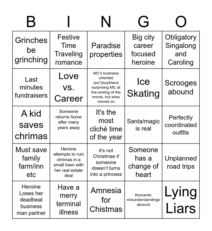 This bingo card has a free space and 44 words: It always be snowing, Lying Liars, Single? In this economy, Heroine Loses her deadbeat business man partner, Heroine Loses her job, Romantic misunderstandings abound, Paradise properties, Learns lesson about the true meaning of Chrimas, Obligatory Singalong and Caroling, Have a merry terminal illness, Big city career focused heroine, Santa/magic is real, it’s not Christmas if someone doesn’t turns into a princess, Heroine attempts to ruin chrimas in a small town with her real estate deal, Family/found family dinner, Amnesia for Chistmas, Contests and Rivalries, A kid saves chrimas, A death in the family, Scrooges abound, Festive Time Traveling romance, Dysfunctional family time, Lets bring my fake GF/BF to Chrimas to impress my family, Grinches be grinching, City Girl Meets Country Boy, Perfectly coordinated outfits, Yeah So i'm related to santa but with better genes, Opening cityscape set to joyous music, Someone has a change of heart, Must save family farm/inn etc, ONE YEAR LATER title card, Unplanned road trips, Carriage rides, They have a chance to tell their secret but chicken out, Someone returns home after many years away, Sooooo much baking, idyllic holiday themed main streets, Enemies to friends to lovers, MC’s business oriented (ex?)boyfriend surprising MC at the ending of the movie, but shes moved on, Last minutes fundraisers, Ice Skating, meet cutes but make it christmasy, Love vs. Career and Really sending the message that big cities are evil/small towns are where its at.