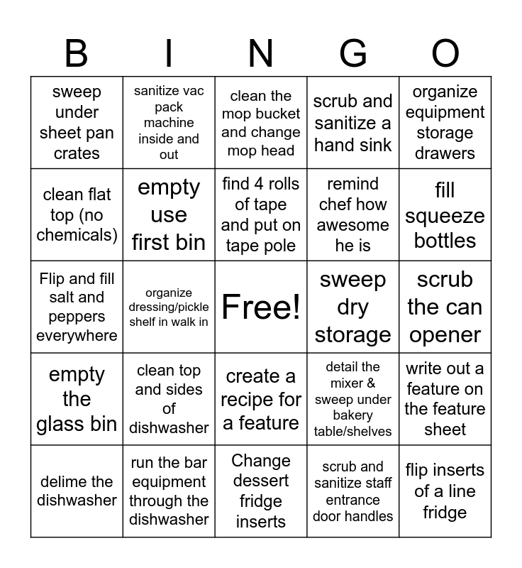 This bingo card has a free space and 80 words: Clean black bus carts, clean a garbage bin, clean the mop bucket and change mop head, take catering items downstairs, change dry storage garbage, sanitize walk in walls and pipes, rags and spoons, win a towel folding race, clean microwave and back table, give Eric his yeti, Clean and SeasonGrill, Clean burners and back splash on line, scrub and sanitize a hand sink, sweep under sheet pan crates, sanitize line fridge seals (gently), clean flat top (no chemicals), Sweep under line fridges and stoves (fryers & grill), clean top and sides of dishwasher, clean top and sides of back ovens, scrub the can opener, sweep and mop under dish pit + washer, organize equipment storage drawers, Flip and fill salt and peppers everywhere, find 4 rolls of tape and put on tape pole, empty use first bin, clean drip trays on line, fill take outs online, scrub walk in fridge and freezer handles, flip bins and trays in walk in fridge, flip equipment bins under prep tables, fill squeeze bottles, organize bakery fridge + freezer, Change dessert fridge inserts, organize pans shelf, delime the dishwasher, sweep dry storage, bring up pop and water, clean 2 shelves, take a garbage out, flip inserts of a line fridge, deck scrub and mop prep area, sweep under everything in walk in fridge and freezer, organize dry storage, bring up extra rolls of paper towel, organize hotel pan storage shelf, sanitize vac pack machine inside and out, clean slicer of debris, hone all knives on the magnet, clean the steamer, scrub outside and lids of roll bins in the back, write out a feature on the feature sheet, organize dressing/pickle shelf in walk in, detail the mixer & sweep under bakery table/shelves, When Lesley yells "Edgar" yell "Vela", Do a song and dance (1 minute show please), Beat Eric in a push up competition, learn 5 Spanish words from Edgar, Cook food for a staff member, make a function prep list, create a recipe for a feature, remind chef how awesome he is, thank Jeff for always bringing in treats, remove tape from every clean dish, Clean top of liters & containers in walk in fridge, Clean sides of deep fryer, Clean table under grill, Help someone complete a BINGO square, Clean walls behind prep tables (beside oven and back room), write a feature using something from the freezer, deep clean a speed rack, empty the glass bin, run the bar equipment through the dishwasher, Get positive feedback on a dish you plated, complement a kitchen staff member for something they did, complement a F.O.H. staff member for something they did, Stick a piece of tape on someone without them noticing, scrub and sanitize staff entrance door handles, Scrub and sanitize loading dock door handles, downsize containers in the walk in and Send a Staff member stars.
