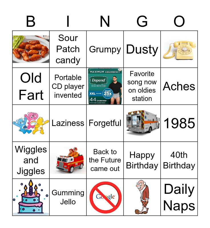 This bingo card has 9 images and 16 words: Old Fart, Sour Patch candy, Back to the Future came out, Favorite song now on oldies station, Happy Birthday, 40th Birthday, Portable CD player invented, Daily Naps, 1985, Grumpy, Aches, Laziness, Forgetful, Gumming Jello, Wiggles and Jiggles and Dusty.