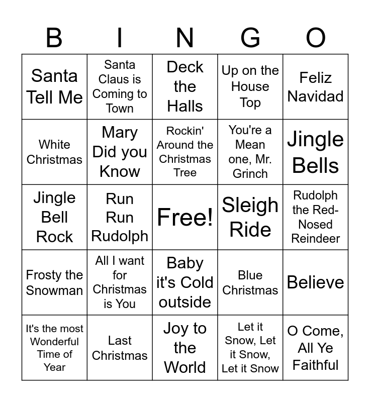 This bingo card has a free space and 24 words: All I want for Christmas is You, Last Christmas, Rockin' Around the Christmas Tree, It's the most Wonderful Time of Year, Feliz Navidad, Santa Tell Me, White Christmas, Santa Claus is Coming to Town, Sleigh Ride, Baby it's Cold outside, You're a Mean one, Mr. Grinch, Jingle Bell Rock, Blue Christmas, Believe, Mary Did you Know, Let it Snow, Let it Snow, Let it Snow, Rudolph the Red-Nosed Reindeer, Deck the Halls, Jingle Bells, Run Run Rudolph, O Come, All Ye Faithful, Frosty the Snowman, Up on the House Top and Joy to the World.