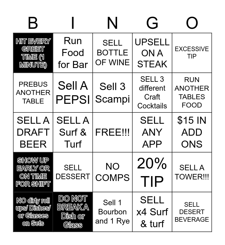 This bingo card has a free space and 28 words: SELL A TOWER!!!, Sell 4 Courses! (App, Soup or Salad, entree and dessert), SELL 3 different Craft Cocktails, SELL x4 Surf & turf, PREBUS ANOTHER TABLE, SELL BOTTLE OF WINE, Run Food for Bar, SHOW UP EARLY OR ON TIME FOR SHIFT, SELL ANY APP, NO dirty roll ups/ Dishes/ or Glasses on Sets, SELL A DRAFT BEER, UPSELL ON A STEAK, DO NOT BREAK A Dish or Glass, Sell 1 Bourbon and 1 Rye, RUN ANOTHER TABLES FOOD, Smiles and Good vibes at your Tables!, SELL DESSERT, Sell A PEPSI, Sell 3 Scampi, NO COMPS, HIT EVERY GREET TIME (1 MINUTE), ALL OUT WORK DONE!, SELL DESERT BEVERAGE, SELL A Surf & Turf, $15 IN ADD ONS, 20% TIP, EXCESSIVE TIP and CORRECT UNIFORM.