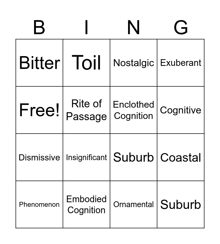 This bingo card has 16 words: Embodied Cognition, Coastal, Nostalgic, Bitter, Dismissive, Toil, Suburb, Ornamental, Free!, Rite of Passage, Phenomenon, Exuberant, Insignificant, Cognitive, Enclothed Cognition and Suburb.