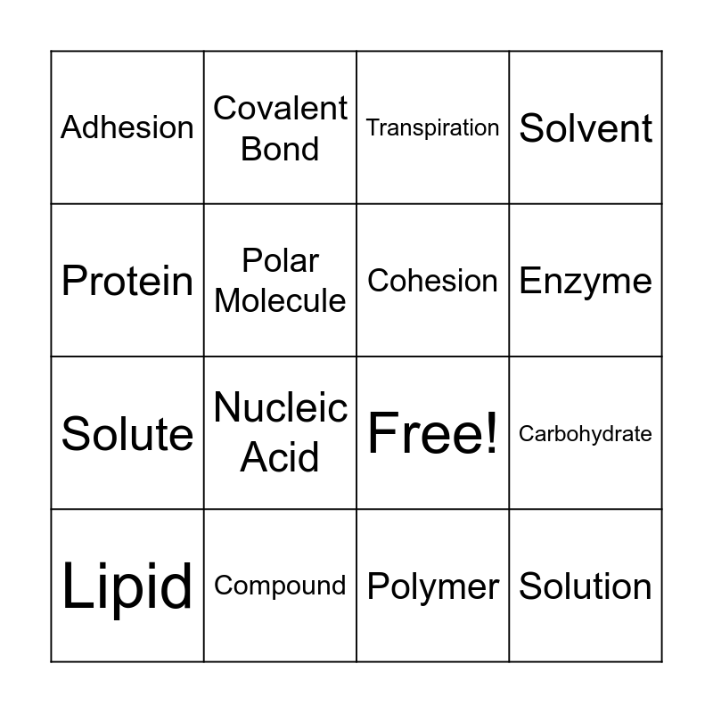 This bingo card has 22 words: Compound, Ionic Bond, Covalent Bond, Hydrogen Bond, Polar Molecule, Cohesion, Adhesion, Transpiration, Free!, Solution, Solute, Solvent, Acid, Base, Polymer, Monomer, Carbohydrate, Lipid, Nucleic Acid, Protein, Enzyme and Phospholipid.