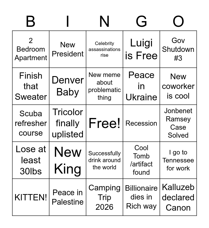 This bingo card has a free space and 24 words: KITTEN!, New King, New meme about problematic thing, Billionaire dies in Rich way, Gov Shutdown #3, 2 Bedroom Apartment, New President, Celebrity assassinations rise, Recession, Jonbenet Ramsey Case Solved, Scuba refresher course, Denver Baby, Cool Tomb /artifact found, I go to Tennessee for work, Finish that Sweater, Peace in Palestine, Camping Trip 2026, Luigi is Free, New coworker is cool, Lose at least 30lbs, Tricolor finally uplisted, Successfully drink around the world, Peace in Ukraine and Kalluzeb declared Canon.