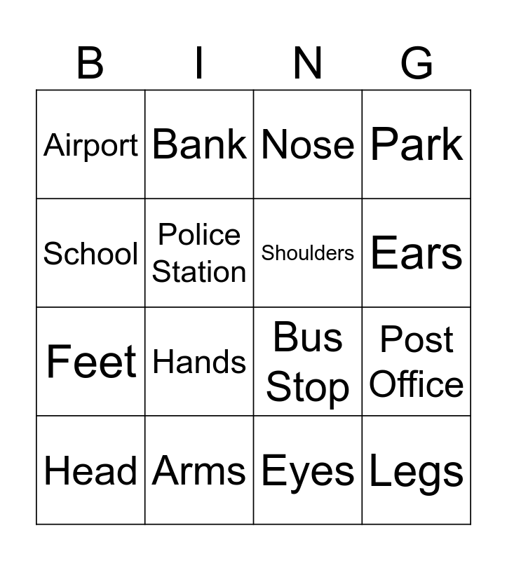 This bingo card has 16 words: Head, Arms, Nose, Park, School, Bank, Bus Stop, Post Office, Airport, Police Station, Eyes, Ears, Feet, Hands, Shoulders and Legs.