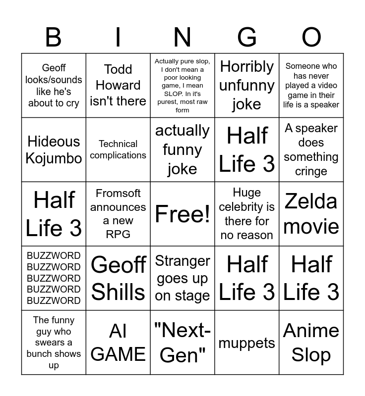 This bingo card has a free space and 24 words: Geoff Shills, AI GAME, actually funny joke, The funny guy who swears a bunch shows up, Someone who has never played a video game in their life is a speaker, Geoff looks/sounds like he's about to cry, Hideous Kojumbo, Todd Howard isn't there, Huge celebrity is there for no reason, Stranger goes up on stage, Half Life 3, Half Life 3, Half Life 3, Half Life 3, Technical complications, muppets, Zelda movie, Actually pure slop, I don't mean a poor looking game, I mean SLOP. In it's purest, most raw form, A speaker does something cringe, Fromsoft announces a new RPG, Anime Slop, BUZZWORD BUZZWORD BUZZWORD BUZZWORD BUZZWORD, Horribly unfunny joke and "Next-Gen".
