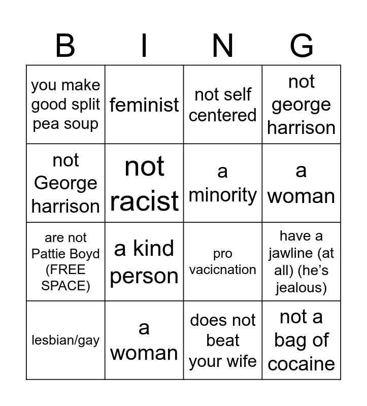 This bingo card has 20 words: have a jawline (at all) (he’s jealous), a minority (living in Britain) (he definitely hates you), not self centered, does not beat your wife, lesbian/gay, not George harrison, a woman, you make good split pea soup, are not Pattie Boyd (FREE SPACE), feminist, a kind person, pro vacicnation, not racist, not a bag of cocaine, a minority, vaccinated, a woman, not george harrison, does not beat your wife and pro vaccination.
