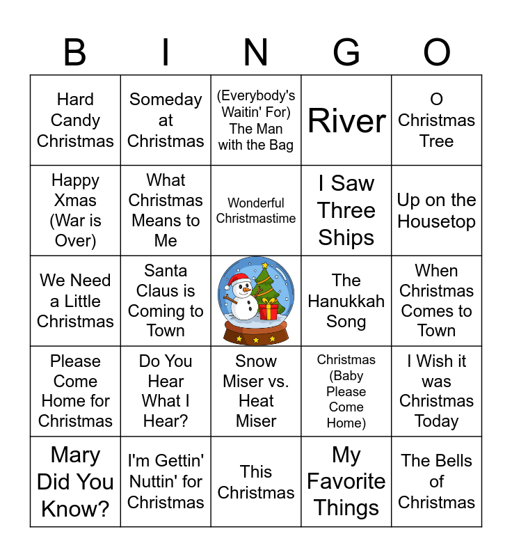 This bingo card has a free space and 39 words: Merry Christmas, Happy Holidays, Dance of the Sugar Plum Fairy, Christmas Wrapping, What Christmas Means to Me, Mary Did You Know?, Snow Miser vs. Heat Miser, Wonderful Christmastime, Little St. Nick, O Christmas Tree, Please Come Home for Christmas, Santa Claus is Coming to Town, River, The Bells of Christmas, When Christmas Comes to Town, The Hanukkah Song, Do You Hear What I Hear?, Santa Tell Me, Hard Candy Christmas, Where Are You Christmas?, Christmas (Baby Please Come Home), Happy Xmas (War is Over), This Christmas, I Saw Three Ships, Up on the Housetop, No. 2 March, Silver and Gold, My Only Wish, Christmas Don't Be Late, 12 Days of Christmas, Someday at Christmas, Peace on Earth/Little Drummer Boy, We're A Couple of Misfits, (Everybody's Waitin' For) The Man with the Bag, I'm Gettin' Nuttin' for Christmas, My Favorite Things, Believe, I Wish it was Christmas Today, We Need a Little Christmas and Baby It's Cold Outside.