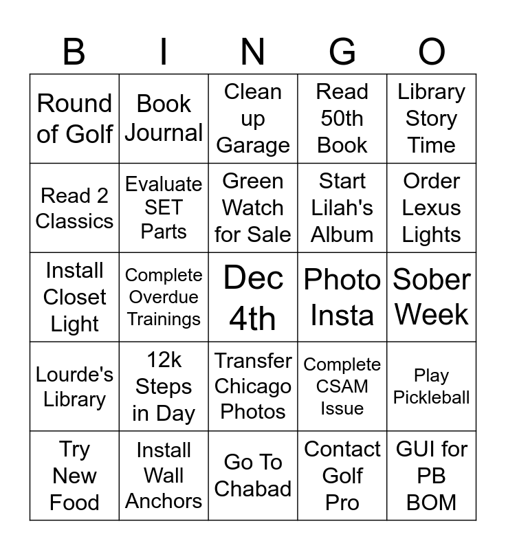 This bingo card has a free space and 24 words: 12k Steps in Day, Install Wall Anchors, Green Watch for Sale, Try New Food, Library Story Time, Round of Golf, Read 2 Classics, Book Journal, Photo Insta, Transfer Chicago Photos, Start Lilah's Album, Install Closet Light, Complete CSAM Issue, Play Pickleball, Evaluate SET Parts, Contact Golf Pro, Sober Week, Clean up Garage, Order Lexus Lights, Complete Overdue Trainings, GUI for PB BOM, Lourde's Library, Read 50th Book and Go To Chabad.