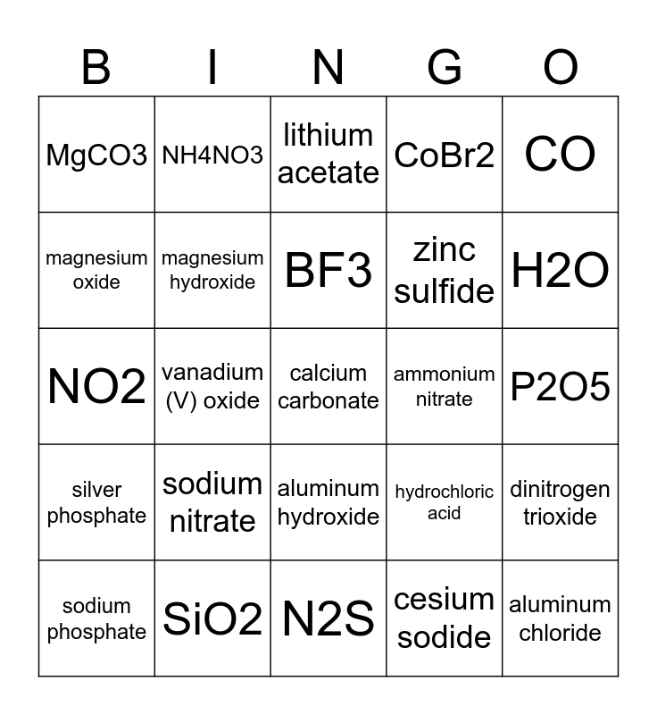 This bingo card has 70 words: Na2CO3, P2O5, NH4Cl, FeSO4, SiO2, BCl3, CoBr2, Hl, CO, P3O8, dinitrogen trioxide, H3N, MgCO3, lithium acetate, phosphorus trifluoride, vanadium (V) oxide, aluminum hydroxide, zinc sulfide, silicon tetrafluoride, silver phosphate, ammonium nitrate, hydrochloric acid, H2O, Fe(OH)3, NiS, hydrocyanic acid, CaCl2, potassium nitrate, cesium sodide, zinc carbonate, NH4NO3, NaClO2, H3PO4, chloric acid, CaO, Li2S, MgBr2, Be(OH)2, potassium iodide, magnesium oxide, aluminum chloride, sodium nitrate, calcium carbonate, lithium sulfate, beryllium phosphide, magnesium hydroxide, sodium phosphate, aluminum carbonate, calcium chloride, sodium cyanide, aluminum oxide, magnesium acetate, ammonium chloride, SO3, N2S, PH3, BF3, P2Br4, SF6, KOH, NO2, nitrogen trichloride, FeCl3, dinitrogen pentoxide, phosphorus pentafluoride, sulfur dibromide, oxygen difluoride, carbon disulfide, nitrogen monoxide and cerium (III) phosphate.