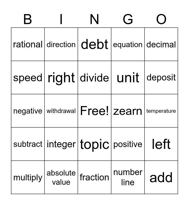 This bingo card has a free space and 24 words: integer, absolute value, divide, multiply, decimal, rational, speed, direction, zearn, topic, unit, negative, positive, left, right, number line, temperature, debt, deposit, withdrawal, add, subtract, equation and fraction.