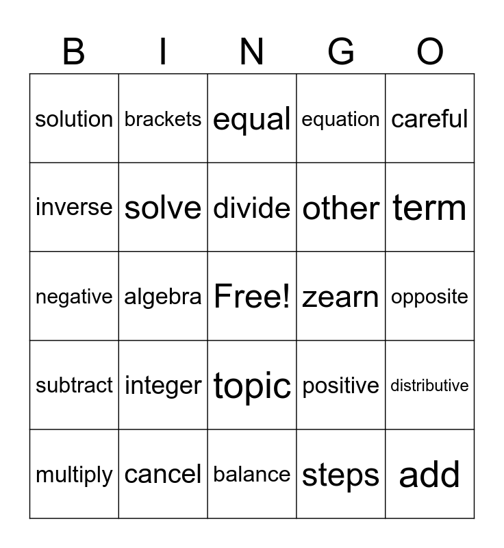 This bingo card has a free space and 24 words: integer, cancel, divide, multiply, careful, solution, inverse, brackets, zearn, topic, other, negative, positive, distributive, solve, steps, opposite, equal, term, algebra, add, subtract, equation and balance.