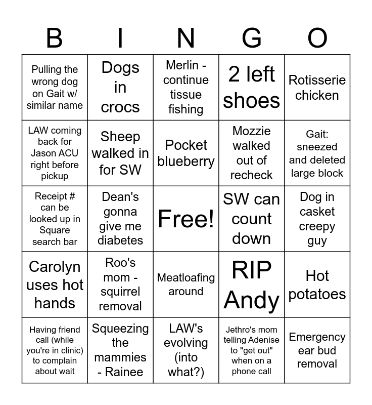 This bingo card has a free space and 43 words: Old faithful and curiosity killed the cat, Emergency ear bud removal, "His pepe stayed in the pocket" - Korvo, Having friend call (while you're in clinic) to complain about wait, Tree crabs, Jethro's mom telling Adenise to "get out" when on a phone call, Merlin - continue tissue fishing, Matcident, Rotisserie chicken, Squeezing the mammies - Rainee, 2 left shoes, SW can count down, Meatloafing around, Roo's mom - squirrel removal, Roscoe caught a squirrel and killed it, LAW's evolving (into what?), PRP instructions on centrifuge, Receipt # can be looked up in Square search bar, Duke dookied (in the only treadmill), Gait: sneezed and deleted large block, Dogs in crocs, Mumford cowboy outfit, Saylor and Ember are siblings??, Pulling the wrong dog on Gait w/ similar name, Jesus banana bread solicitor, Dog in casket creepy guy, Lucy - momma to kittens!, Bolo lame on left front, RIP Andy, Carolyn uses hot hands, Just Jack!, Hot potatoes, Accidentally turning on jet on UT, Dean's gonna give me diabetes, Eating all the bunt cakes from AEC, Talking to watch instead of walkie - Kristen, We lost Gary (the plant hopper) - RIP, Pocket blueberry, LAW coming back for Jason ACU right before pickup, Mozzie walked out of recheck, LAW's sound machine - leaking water?, Sheep walked in for SW and Mismatching yogurt lids to upset Cameron.
