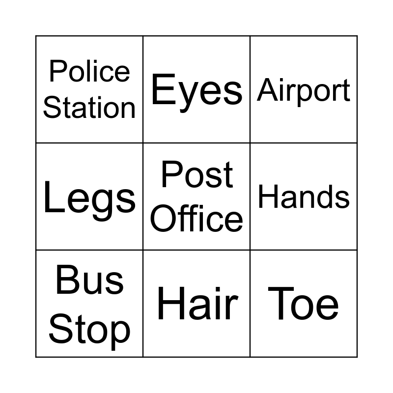 This bingo card has 9 words: Bus Stop, Post Office, Airport, Police Station, Eyes, Hands, Legs, Hair and Toe.