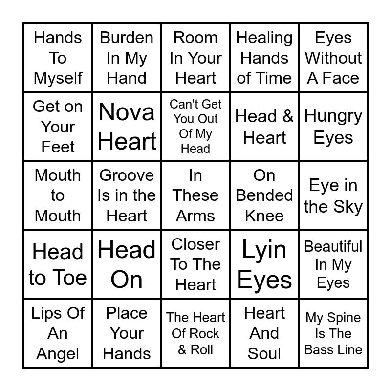 This bingo card has 67 words: [I Just] Died In Your Arms, A Good Heart, Bad To The Bone, Beautiful In My Eyes, Bette Davis Eyes, Brothers In Arms, Burden In My Hand, Burning Heart, Can't Get You Out Of My Head, Celebrity Skin, Closer To The Heart, Don't Close Your Eyes, Eye in the Sky, Eyes Without A Face, Fat Lip, Get on Your Feet, Groove Is in the Heart, Hands To Myself, Harden My Heart, Head & Heart, Head On, Head to Toe, Healing Hands of Time, Heart And Soul, Heart Of Glass, Heart Skips A Beat, Hip To Be Square, Hold Your Head Up, Hungry Eyes, Hungry Heart, In These Arms, In Your Eyes, Jar Of Hearts, Legs, Lips Like Sugar, Lips Of An Angel, Listen To Your Heart, Lyin Eyes, Mouth to Mouth, My Spine Is The Bass Line, Nothing Breaks Like a Heart, Nova Heart, On Bended Knee, Our Lips Are Sealed, Out Of My Head, Owner of a Lonely Heart, Piece of My Heart, Place Your Hands, Private Eyes, Restless Heart, Room In Your Heart, Sexy Eyes, Shape Of My Heart, Tell It to My Heart, The Captain of Her Heart, The Heart Of Rock & Roll, The Way to Your Heart, Tip of My Tongue, Too Much Time On My Hands, Total Eclipse of the Heart, Un-Break My Heart, Unchain My Heart, Under My Thumb, We Close Our Eyes, When Your Heart Is Weak, Whirlpool Heart and Young Hearts Run Free.