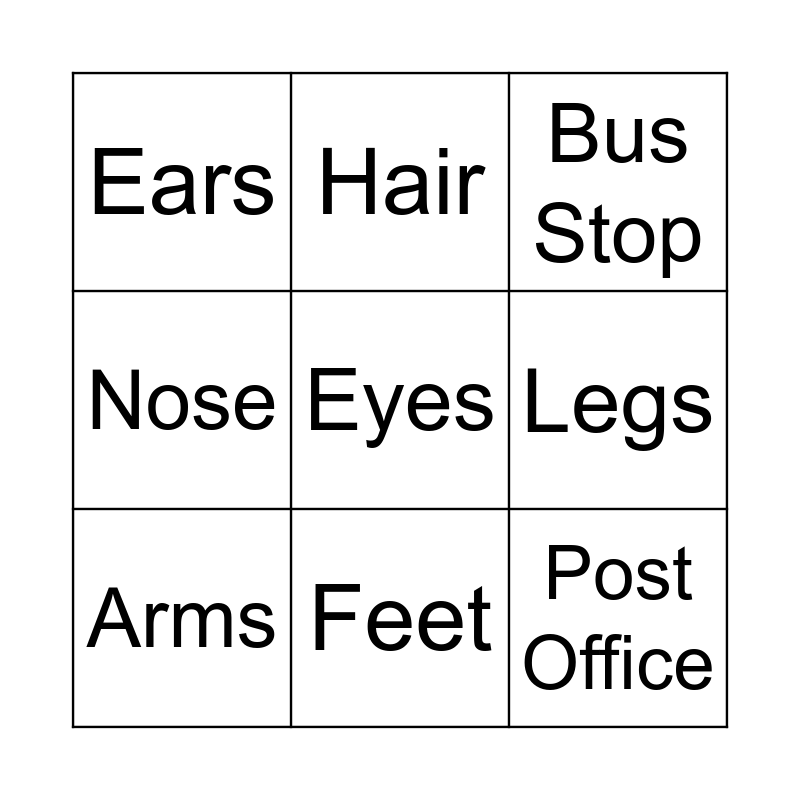 This bingo card has 18 words: Arms, School, Bus Stop, Ears, Feet, Legs, Fire Station, Hair, Finger, Nose, Bank, Post Office, Airport, Eyes, Hands, Hospital, Mouth and Supermarket.