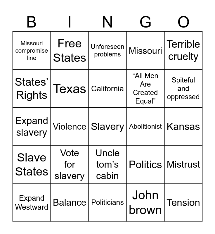 This bingo card has a free space and 27 words: Politics, Equal, “All Men Are Created Equal”, Politicians, States’ Rights, Unforeseen problems, Free States, Slave States, Abolitionist, Mistrust, Expand slavery, Missouri, Expand Westward, Balance, Spiteful and oppressed, Compromises, Texas, California, Vote for slavery, Missouri compromise line, Kansas, John brown, Violence, Tension, Uncle tom’s cabin, Terrible cruelty and Morally corrupt.