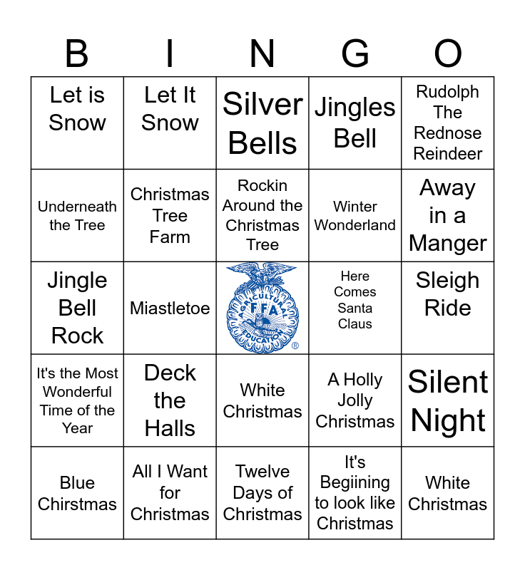 This bingo card has a free space and 24 words: Deck the Halls, All I Want for Christmas, Rockin Around the Christmas Tree, Blue Chirstmas, Rudolph The Rednose Reindeer, Let is Snow, Underneath the Tree, Let It Snow, Here Comes Santa Claus, White Christmas, Winter Wonderland, Jingle Bell Rock, A Holly Jolly Christmas, Silent Night, Christmas Tree Farm, It's Begiining to look like Christmas, Sleigh Ride, Silver Bells, Away in a Manger, Miastletoe, White Christmas, It's the Most Wonderful Time of the Year, Jingles Bell and Twelve Days of Christmas.