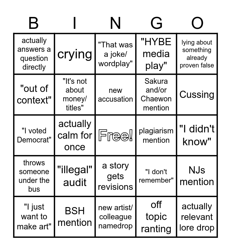 This bingo card has a free space and 24 words: "illegal" audit, BSH mention, new accusation, "I just want to make art", lying about something already proven false, actually answers a question directly, "out of context", crying, plagiarism mention, a story gets revisions, Sakura and/or Chaewon mention, "I voted Democrat", "I don't remember", NJs mention, "It's not about money/ titles", off topic ranting, "I didn't know", "That was a joke/ wordplay", Cussing, actually calm for once, actually relevant lore drop, throws someone under the bus, "HYBE media play" and new artist/ colleague namedrop.