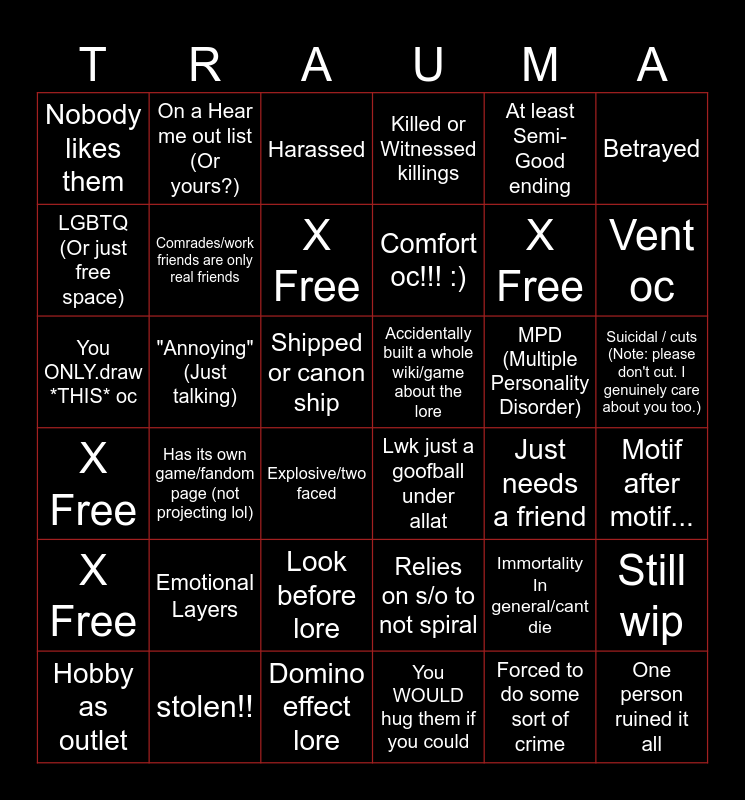 This bingo card has 37 words: Immortality In general/cant die, Relies on s/o to not spiral, Forced to do some sort of crime, LGBTQ (Or just free space), Has its own game/fandom page (not projecting lol), MPD (Multiple Personality Disorder), Comrades/work friends are only real friends, You WOULD hug them if you could, At least Semi-Good ending, Hobby as outlet, Vent oc, Killed or Witnessed killings, You ONLY.draw *THIS* oc, Shipped or canon ship, Betrayed, Accidentally built a whole wiki/game about the lore, Emotional Layers, Harassed, Suicidal / cuts (Note: please don't cut. I genuinely care about you too.), "Annoying" (Just talking), Nobody likes them, Comfort oc!!! :), Explosive/two faced, Just needs a friend, stolen!!, Motif after motif..., On a Hear me out list (Or yours?), Domino effect lore, Still wip, Look before lore, Cutie!!, Lwk just a goofball under allat, X Free, X Free, X Free, X Free and One person ruined it all.