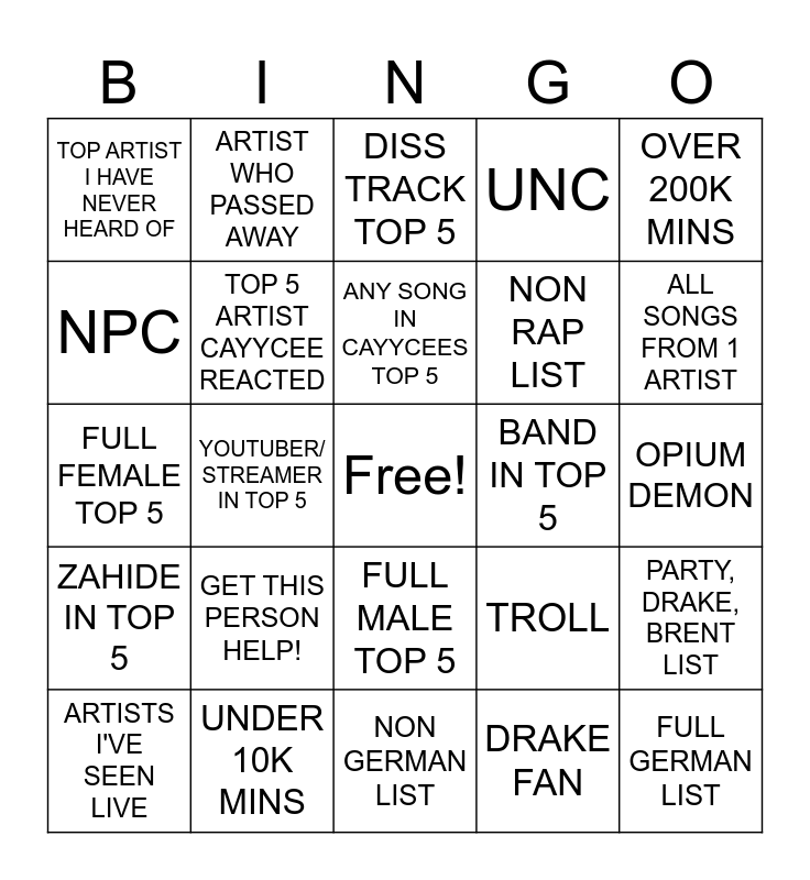 This bingo card has a free space and 24 words: GET THIS PERSON HELP!, UNDER 10K MINS, ANY SONG IN CAYYCEES TOP 5, ARTISTS I'VE SEEN LIVE, OVER 200K MINS, TOP ARTIST I HAVE NEVER HEARD OF, NPC, ARTIST WHO PASSED AWAY, BAND IN TOP 5, FULL MALE TOP 5, NON RAP LIST, FULL FEMALE TOP 5, TROLL, PARTY, DRAKE, BRENT LIST, TOP 5 ARTIST CAYYCEE REACTED, DRAKE FAN, OPIUM DEMON, DISS TRACK TOP 5, ALL SONGS FROM 1 ARTIST, YOUTUBER/ STREAMER IN TOP 5, FULL GERMAN LIST, ZAHIDE IN TOP 5, UNC and NON GERMAN LIST.