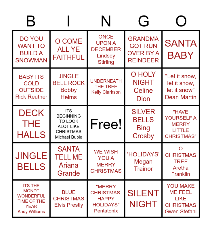 This bingo card has a free space and 34 words: WHITE CHRISTMAS Bing Crosby, SILENT NIGHT, "ITS CHRISTMAS TIME PRESTTY BABY" Elvis Prestly, ALL I WANT FOR CHRISTMAS IS YOU Mariah Carey, JINGLE BELLS, JINGLE BELL ROCK Bobby Helms, SANTA BABY, ITS THE MONDT WONDERFUL TIME OF THE YEAR Andy Williams, O COME ALL YE FAITHFUL, FROSTY THE SNOW MAN, UNDERNEATH THE TREE Kelly Clarkson, ONCE UPON A DECEMBER Lindsey Stirling, CHRISTMAS LIGHTS Coldplay, RUDOLPH THE RED NOSE REINDEER, SILVER BELLS Bing Crosby, "Let it snow, let it snow, let it snow" Dean Martin, BLUE CHRISTMAS Elvis Prestly, DECK THE HALLS, SANTA TELL ME Ariana Grande, 'HOLIDAYS' Megan Trainor, WE WISH YOU A MERRY CHRISTMAS, WINTER WONDERLAND Johnny Mathis, DO YOU WANT TO BUILD A SNOWMAN, "HAVE YOURSELF A MERRY LITTLE CHRISTMAS", "MERRY CHRISTMAS, HAPPY HOLIDAYS" Pentatonix, YOU MAKE ME FEEL LIKE CHRISTMAS Gwen Stefani, GRANDMA GOT RUN OVER BY A REINDEER, 'SNOWMAN' Sia, O HOLY NIGHT Celine Dion, BABY ITS COLD OUTSIDE Rick Reuther, RUN, RUN, RUDOLPH Patrick Carpenter, ITS BEGINNING TO LOOK ALOT LIKE CHRISTMAS Michael Buble, O CHRISTMAS TREE Aretha Franklin and MY FAVORITE THINGS Rod Stewart.