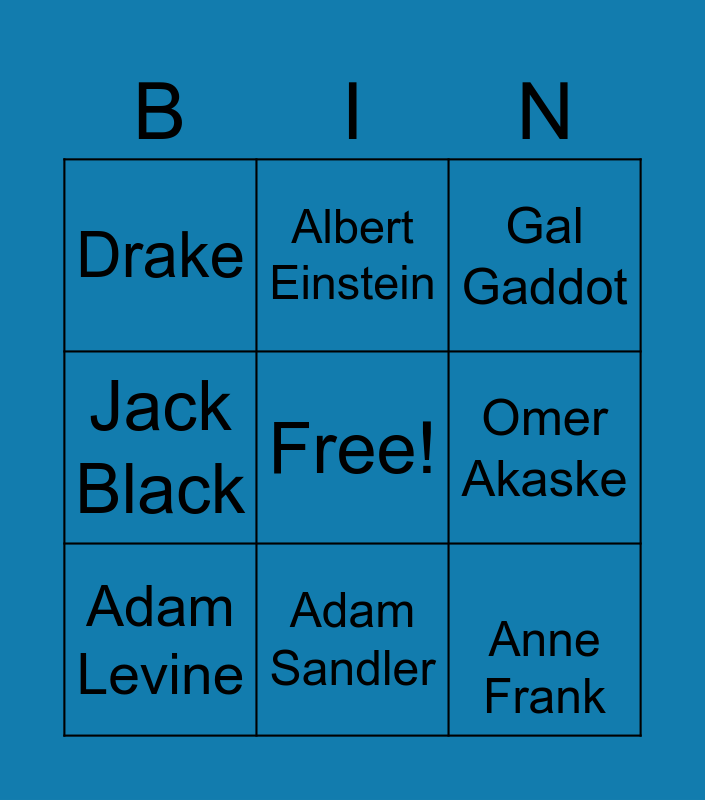 This bingo card has a free space and 8 words: Jack Black, Albert Einstein, Omer Akaske, Adam Levine, Gal Gaddot, Drake, Adam Sandler and Anne Frank.