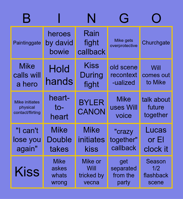 This bingo card has a free space and 24 words: Mike Double takes, Mike askes whats wrong, Kiss During fight, Kiss, Churchgate, Paintinggate, Mike calls will a hero, heroes by david bowie, Mike uses Will voice, Mike initiates kiss, old scene recontext -ualized, Mike initiates physical contact/flirting, "crazy together" callback, Lucas or El clock it, Hold hands, get separated from the party, talk about future together, Rain fight callback, Will comes out to Mike, heart-to-heart, Season 1/2 flashback scene, "I can't lose you again", Mike gets overprotective and Mike or Will tricked by vecna.