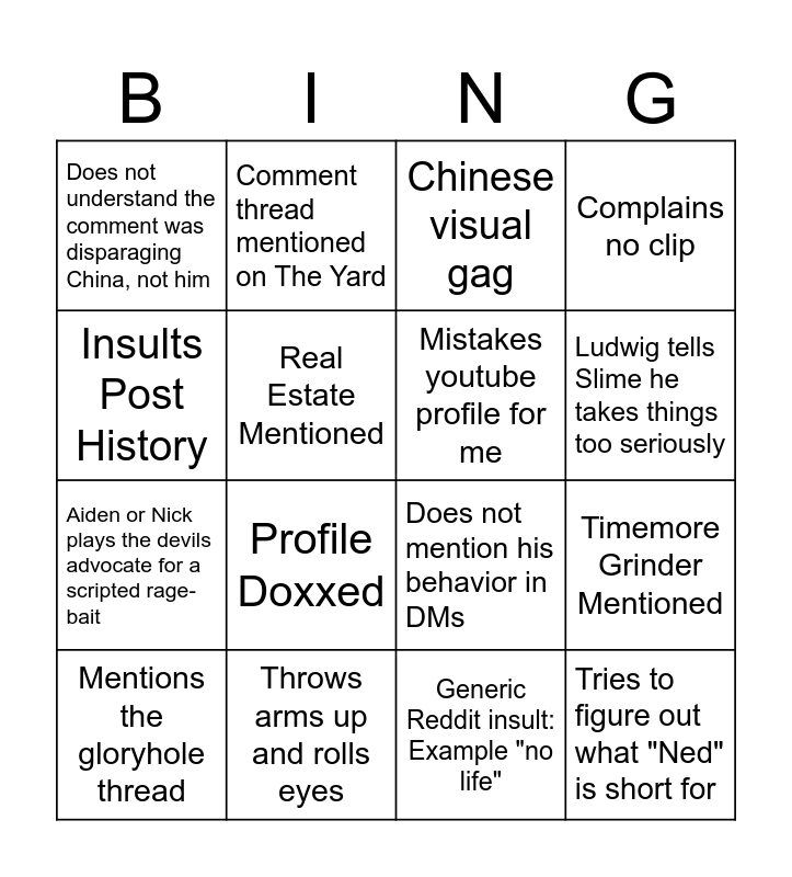 This bingo card has 16 words: Mentions the gloryhole thread, Throws arms up and rolls eyes, Chinese visual gag, Complains no clip, Insults Post History, Comment thread mentioned on The Yard, Does not mention his behavior in DMs, Timemore Grinder Mentioned, Does not understand the comment was disparaging China, not him, Real Estate Mentioned, Generic Reddit insult: Example "no life", Ludwig tells Slime he takes things too seriously, Aiden or Nick plays the devils advocate for a scripted rage-bait, Profile Doxxed, Mistakes youtube profile for me and Tries to figure out what "Ned" is short for.