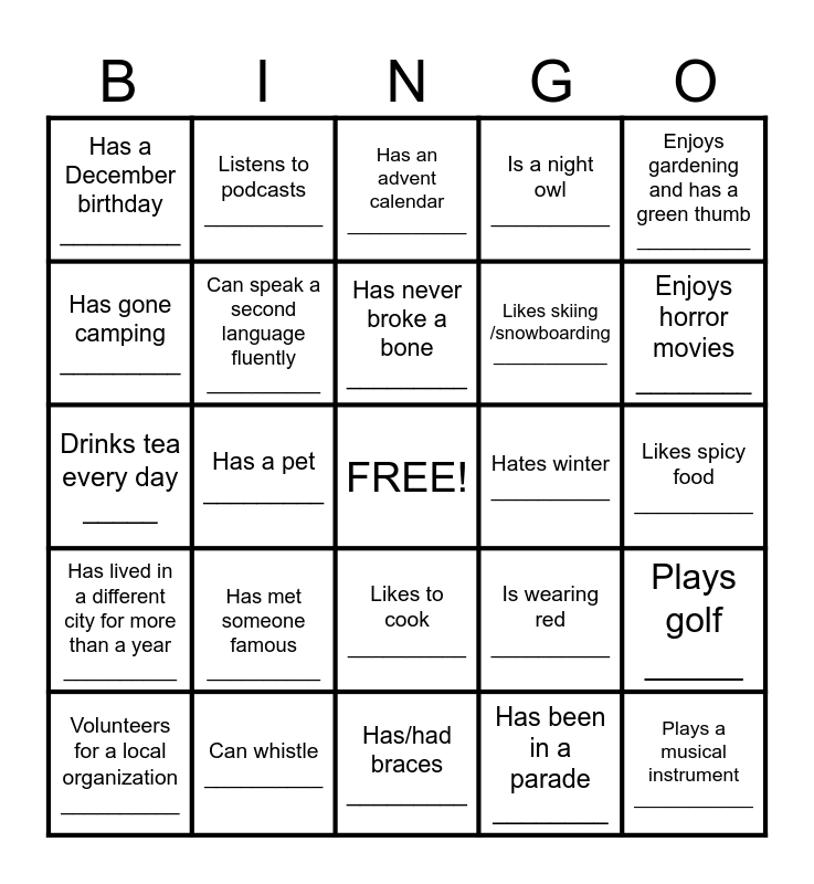 This bingo card has a free space and 39 words: Drank coffee this morning __________, Finishes Xmas shopping early __________, Traveled to more than 3 countries ____________, Can speak a second language fluently __________, Volunteers for a local organization __________, Likes to cook __________, Has never broke a bone _________, Loses a glove or scarf every winter __________, Enjoys gardening and has a green thumb __________, Has lived in a different city for more than a year __________, Has a pet _________, Is a night owl __________, Plays a musical instrument ___________, Likes spicy food __________, Hates winter __________, Has met someone famous __________, Likes pineapple on pizza ________, Has a December birthday _________, Knows how to knit/ crochet ___________, Is wearing red __________, Has gone camping _________, Has/had braces _________, Likes skiing /snowboarding ___________, Enjoys horror movies ________, Practices yoga or meditation regularly __________, Hand-makes holiday presents _________, Has a snack stash at work _________, Is left handed _________, Has built a snowman __________, Listens to podcasts __________, Likes seafood ___________, Doesn't like candy canes ___________, Has an advent calendar ___________, Can whistle __________, Has been in a parade ________, Can do a cartwheel _______, Plays golf _____, Drinks tea every day _____ and Likes hot chocolate _______.