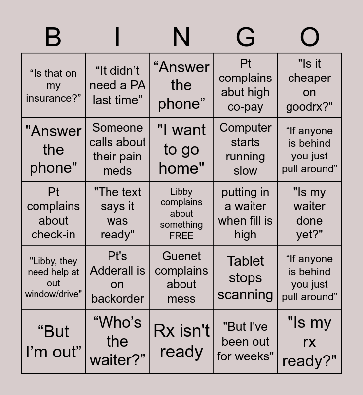 This bingo card has a free space and 33 words: Awni wanders off, Order is late, "The text says it was ready", “I watched my Dr send it”, "Libby, they need help at out window/drive", Someone calls about their pain meds, "Is it cheaper on goodrx?", “But I’m out”, “It didn’t need a PA last time”, "Did anyone talk to-", "I want to go home", “Answer the phone”, Pt pulls up to drive, right at close, “I got a text/call saying it was ready”, putting in a waiter when fill is high, “If anyone is behind you just pull around”, “Who’s the waiter?”, Pt complains about check-in, Pt's Adderall is on backorder, Tablet stops scanning, Guenet complains about mess, Change for $50/$100, “Is that on my insurance?”, "Is my waiter done yet?", Rx isn't ready, "Is my rx ready?", Pt complains abut high co-pay, Computer starts running slow, "Answer the phone", “If anyone is behind you just pull around”, "What's a PA?", "But I've been out for weeks" and “If anyone is behind you just pull around”.