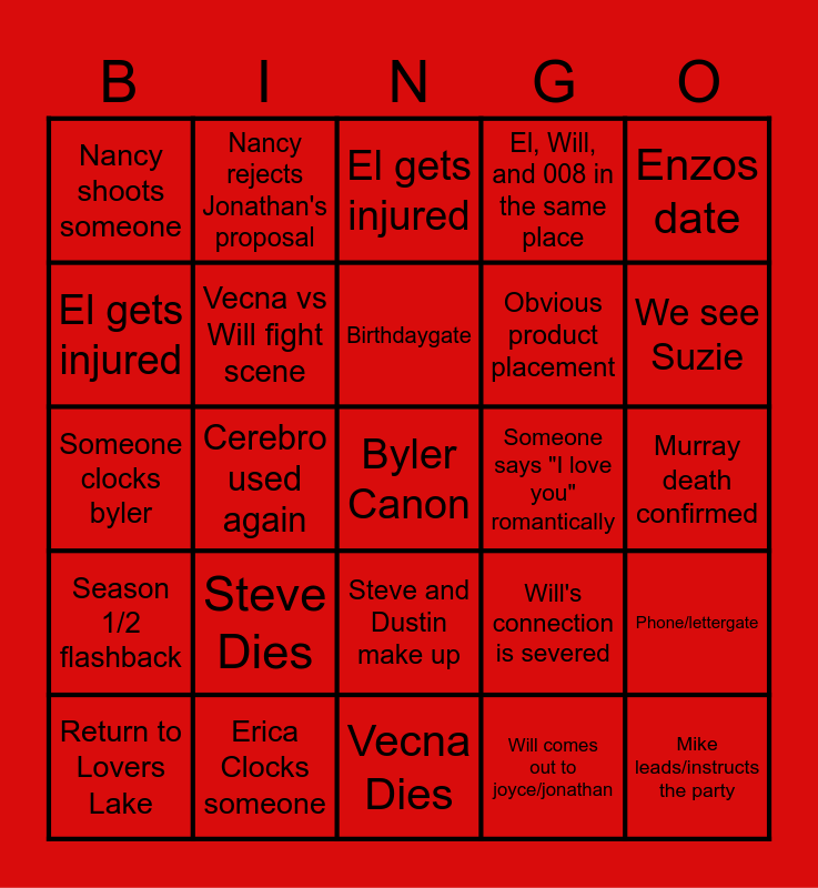 This bingo card has a free space and 24 words: Steve Dies, Erica Clocks someone, Birthdaygate, Return to Lovers Lake, Enzos date, Nancy shoots someone, El gets injured, Nancy rejects Jonathan's proposal, Someone says "I love you" romantically, Steve and Dustin make up, Obvious product placement, Someone clocks byler, Will's connection is severed, Phone/lettergate, Vecna vs Will fight scene, Will comes out to joyce/jonathan, Murray death confirmed, El gets injured, We see Suzie, Cerebro used again, Mike leads/instructs the party, Season 1/2 flashback, El, Will, and 008 in the same place and Vecna Dies.